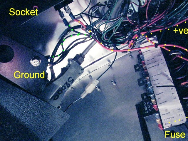 Once the fuse is installed, the connectors are inside the fuse box. In the following picture you can also see the wiring connected to the socket and the -ve connection.